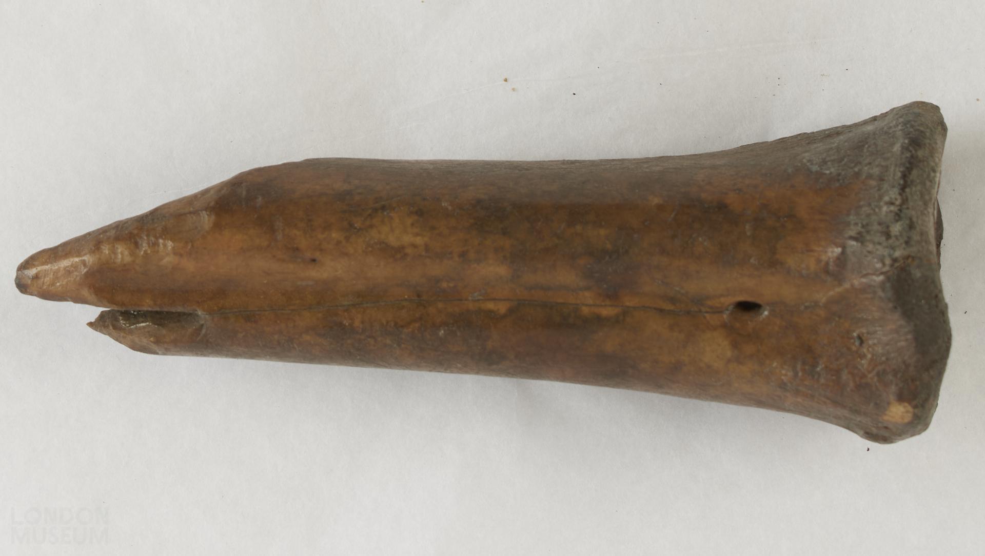 Piercer made of bovine metatarsus bone, left side. Proximal end of the mid-shaft. The mid-shaft towards the distal end has been made into a point on the anterior surface. THe hole at the proximal end has been enlarged.