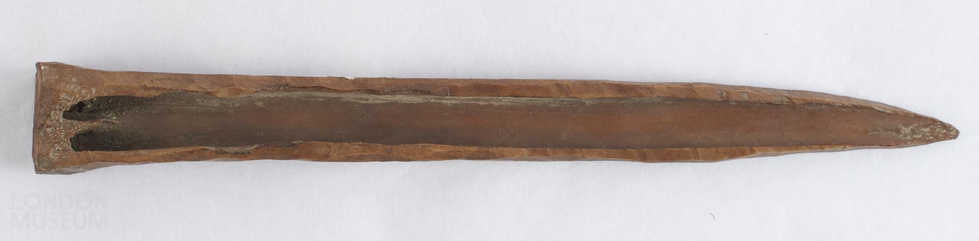 Bone piercer, longitudinal slice through the right metatarsal of a fallow deer [Dama dama]. Proximal articulation and mid-shaft. The shaft has been sliced and shaved down, exposing the medullary cavity along the entire length on one side. There is a point at the distal end.