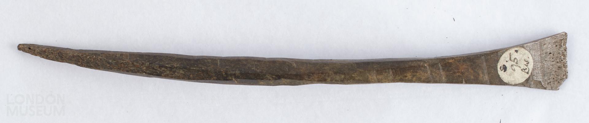 Bone point formed from longitudinal slice though a bovine or horse long bone. The shank has been shaved down, exposing the cancellous bone structure at the head, and tip on one side.