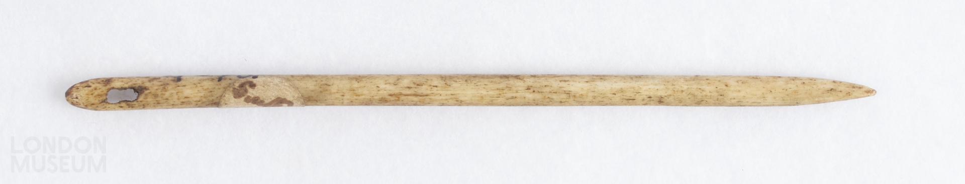 Bone needle formed from a longitudinal strip of bovine or horse long bone. Shank tapers towards the point. Two intersecting round holes form the eye.