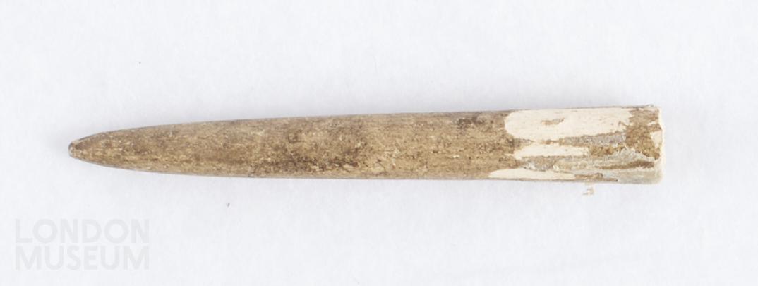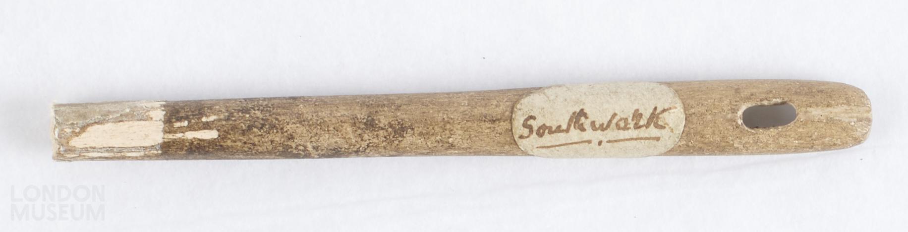 Incomplete bone needle formed from a longitudinal slice of bovine or horse long bone. Broken shank tapers to the point. Two round intersecting holes form an elongated eye. There is a thin groove cut into the longitudinal axis of the bone, across the top of the head to the eye, on either side. The needle is in two pieces.