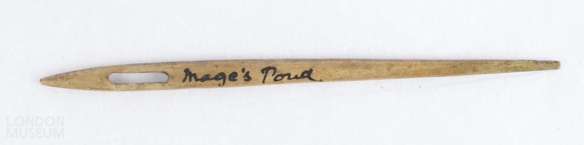 Bone needle formed from longitudinal flat slice of bovine or horse long bone. Finely worked. Elongated eye. The shaft tapers towards the point. Slight traces of copper staining.