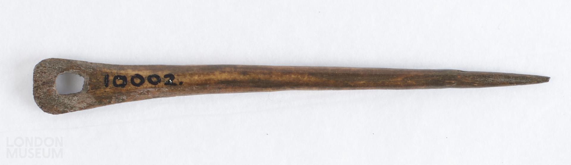 Bone needle. Probably pig fibula. There is a large hole throught the shaft at the head, which has squared off edges. The shaft tapers towards the point. The tip has broken off.