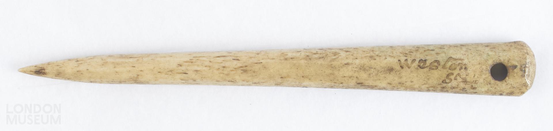 Bone needle, elliptical sectioned, well finished. Formed from longitudinal section from horse or bovine long bone. The shaft tapers towards a sharp point. There is a neat round hole through the shaft at the head, which forms the eye.