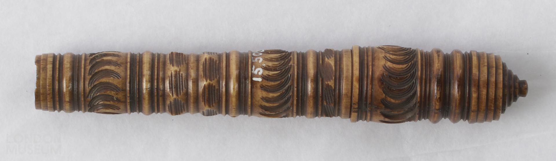 Needle case, possibly for bodkins. Possibly from a horse or bovine long bone. Two surviving sections screw together to form a hollow cylinder which gradually tapers towards the open end. The cap is sealed by a lathe turned plug with a finial. The main section widens gradually towards the screw thread locking perfectly into the cap which has a slightly larger diameter to accommodate it. There is a further thread inside the other end of the main section, which remains open, the end cap having been lost. The whole of the case exterior has been extremely well turned with circumferential grooves, of varying widths, some with angular edges, others rounded. These are interspersed with incised designs which are precisely delinated.