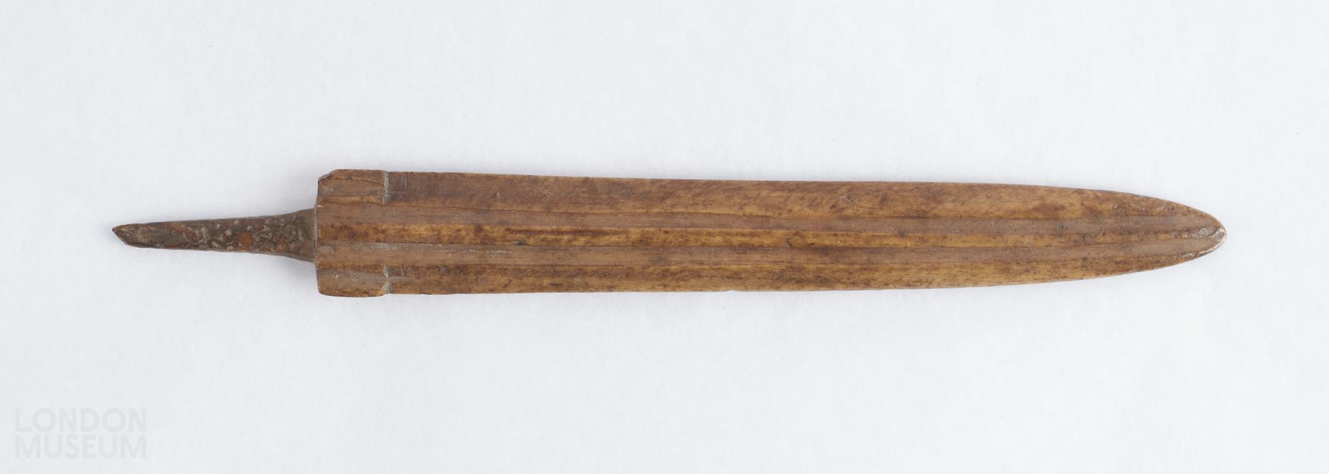 Knife formed from a longitudinal slice through bovine, horse or red deer long bone. The bone has been cut down and shaped to form a straight parallel sided blade which tapers to a rounded point. There are two grooves along the entire longitudinal axis of the blade on one side, two short grooves at the junction of the blade and the short tapering whittle tang. The tang terminates in an obliquely cut point.