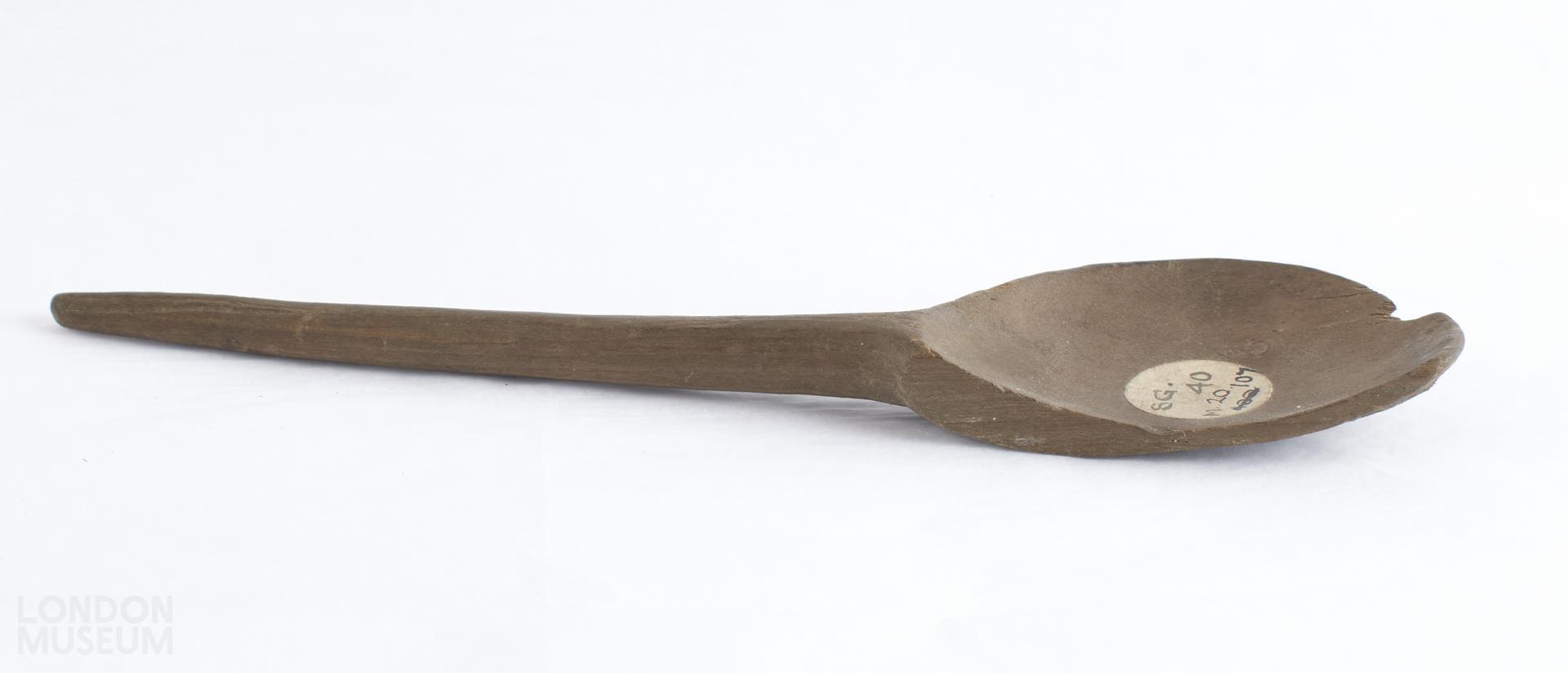Wood which has been cut down and shaped to form a spoon. Only half of the round bowl survives together with the circular sectioned stem which tapers to an obliquely blunted point. Part of the bowl edge is damaged.