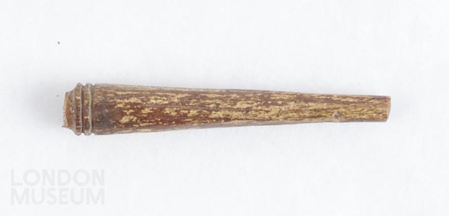 The broken off round sectioned shank of an ear scoop. There are two incised circumferential grooves at the handle end. The shank tapers towards the scoop which has broken off. Longitudinal slice through a long bone.