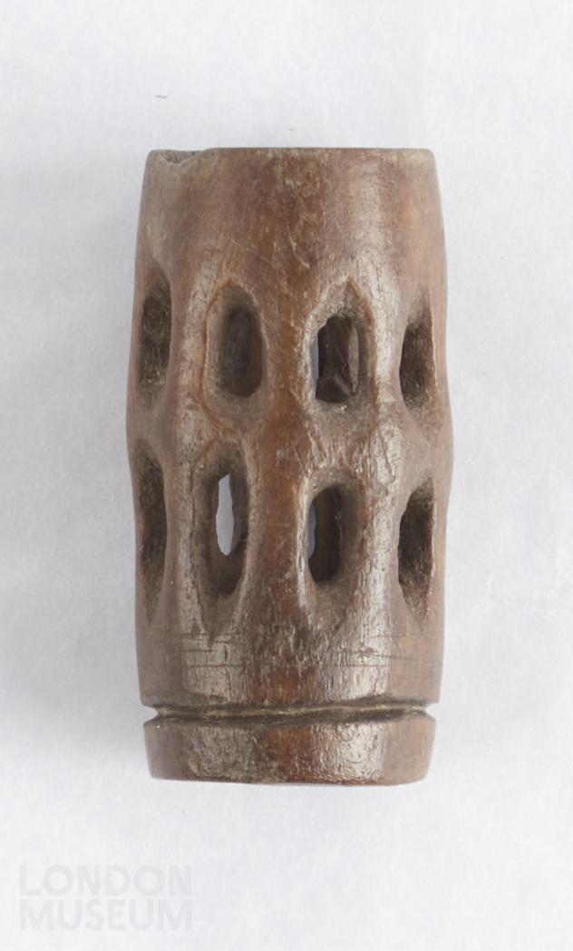 Longitudinal cylindrical hollow section of bone, with irregularly cut elongated perforations around the circumference in two bands of ten. There is an incised circumferential groove as decoration at one end. The bone is well polished.
