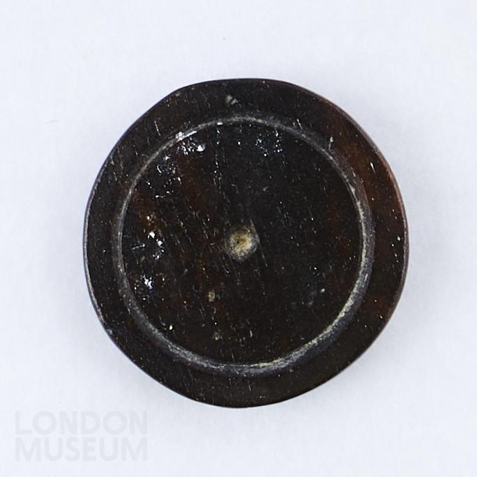 Bone disc. Flat disc with chamfered edge and polished surfaces. Lathe-turned with central perforation and incised concentric circle for decoration.