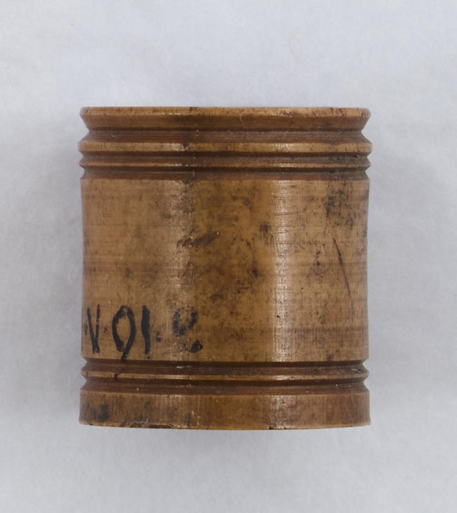 Section of long bone, probably sheep or goat metapodial. The medullary cavity has been cleaned out and slightly enlarged towards one end. The exterior has been extremely well turned to form a complete cylinder with circumferential grooves at each end for decoration.