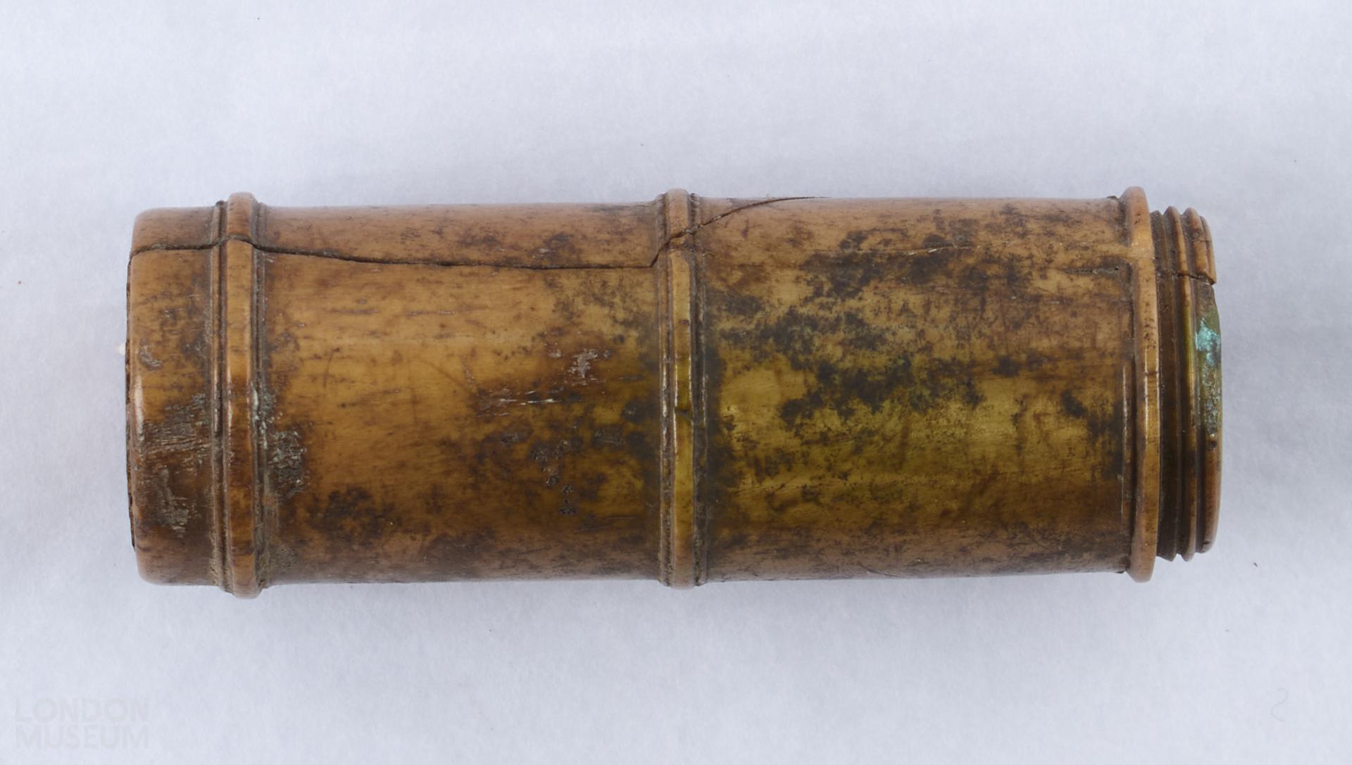 Section of long bone, probably cattle metapodial. The medullary cavity has been cleaned out and smoothed by turning, forming a cylinder with external screw thread at one end and internal screw thread at the other. A flat discoid plug with damaged edges screws into one end. The exterior has been turned and decorated with circumferential bands. There is a crack in the longitudinal axis. Well polished.