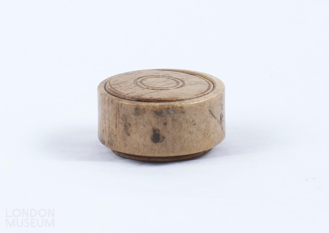 Section of long bone. The medullary cavity has been removed, enlarged and smoothed by turning to form a perfectly shaped cylinder with an internal screw thread at one end and external protruding screw thread at the other. A flat disc with screw thread around the circumference and incised circumferential grooves for decoration fits into one end and lies flush with the end of the cylinder. Although the edges of the cap are damaged, the disc will not lock into place, and may fit onto another piece, now missing. The two pieces are extremely well made with a high polish.