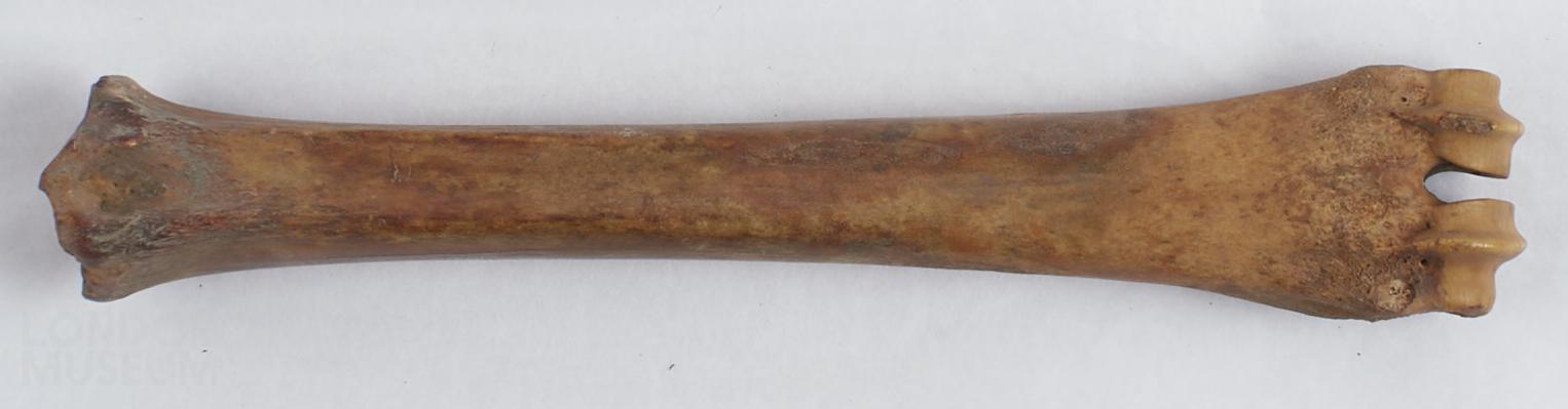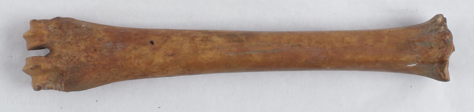 Either a sheep or goat bone. Bone is fully fused, thus the animal was over 20 months - 2 years old.