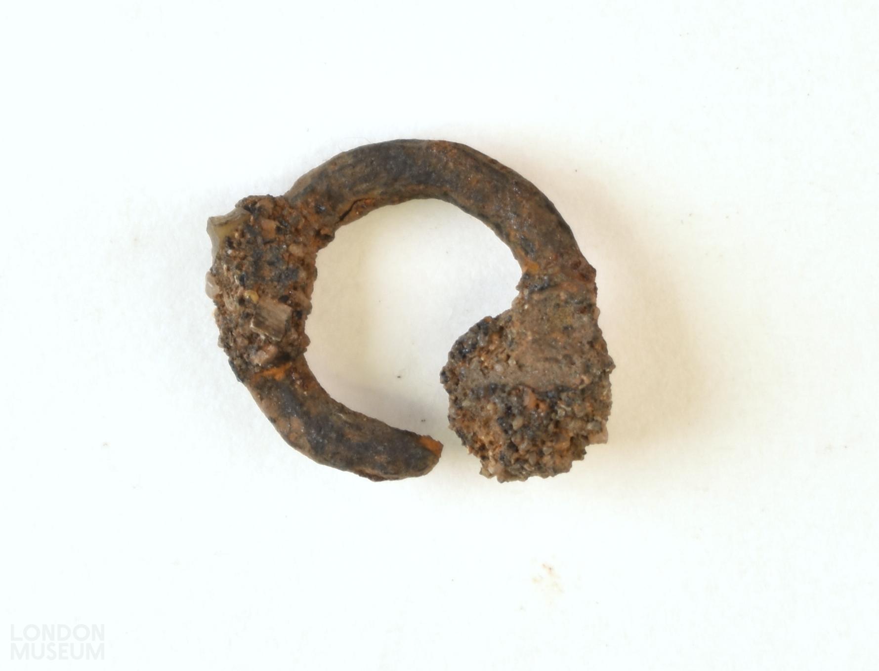 Buckle with round frame which has cracked open. No pin. Corroded. Undecorated.