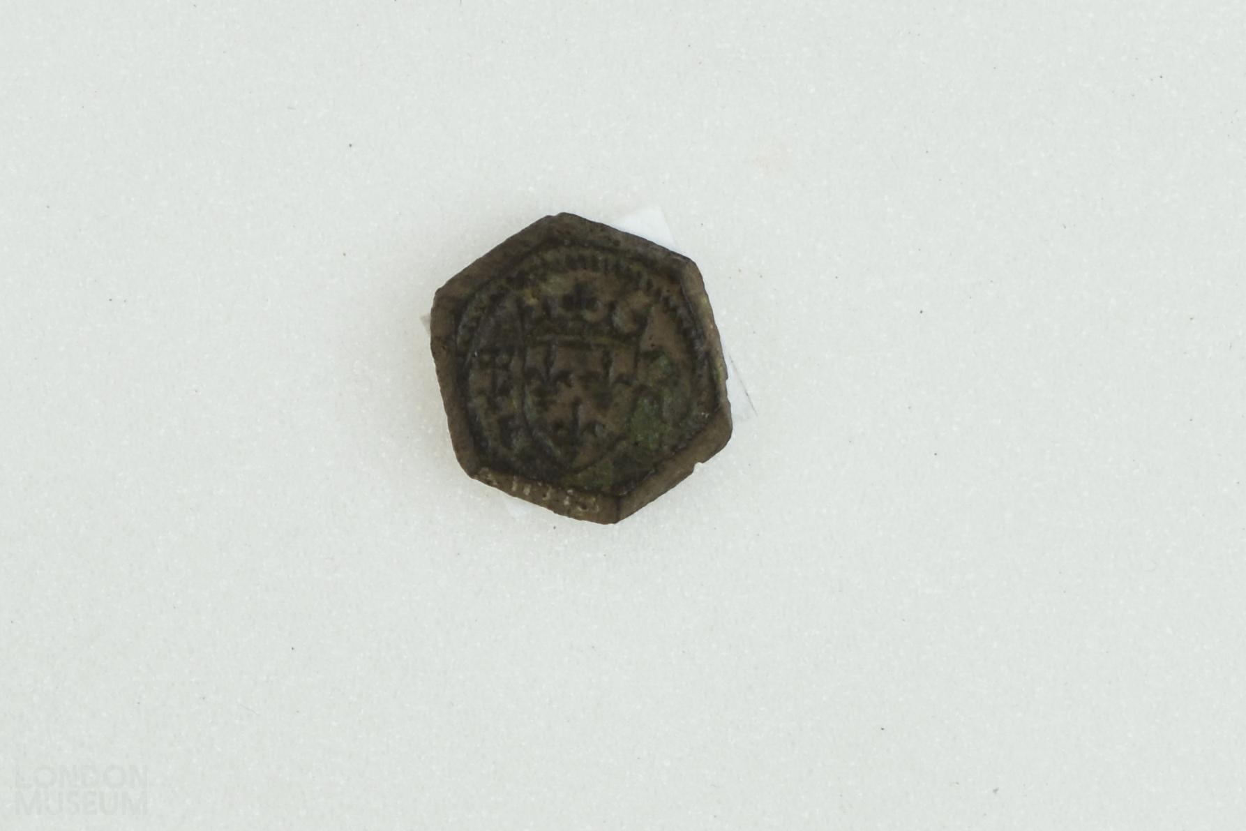 A hexagonal coin weight. It is stamped with a coat of arms with three crowned fleur de lys. The other side has an indistinct mark.