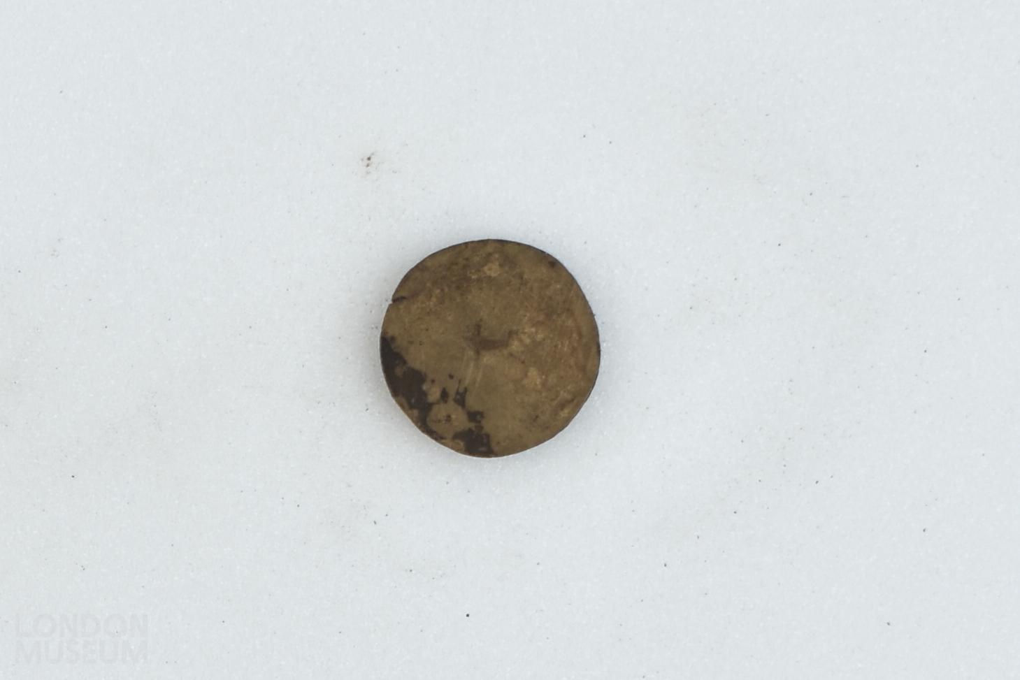 Circular copper alloy weight. Top face stamped with a capital 'I' in centre. Reverse scratched. Corroded.