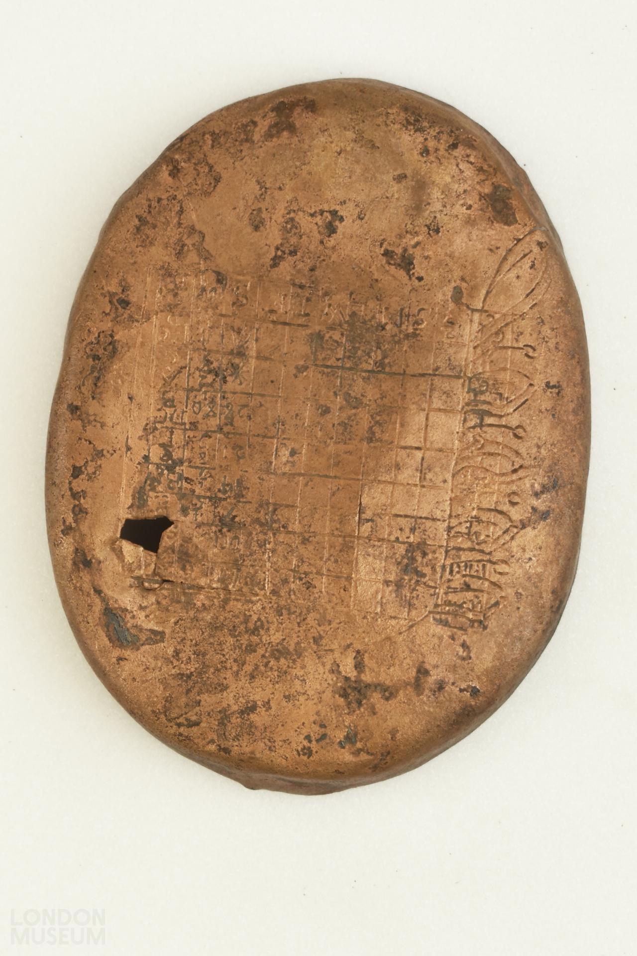 Trial perpetual calendar dated to the 17th century. The dominical letters are linked with the days of the week. The cycle probably began on a leap year. It may also have been used as a tobacco lid.