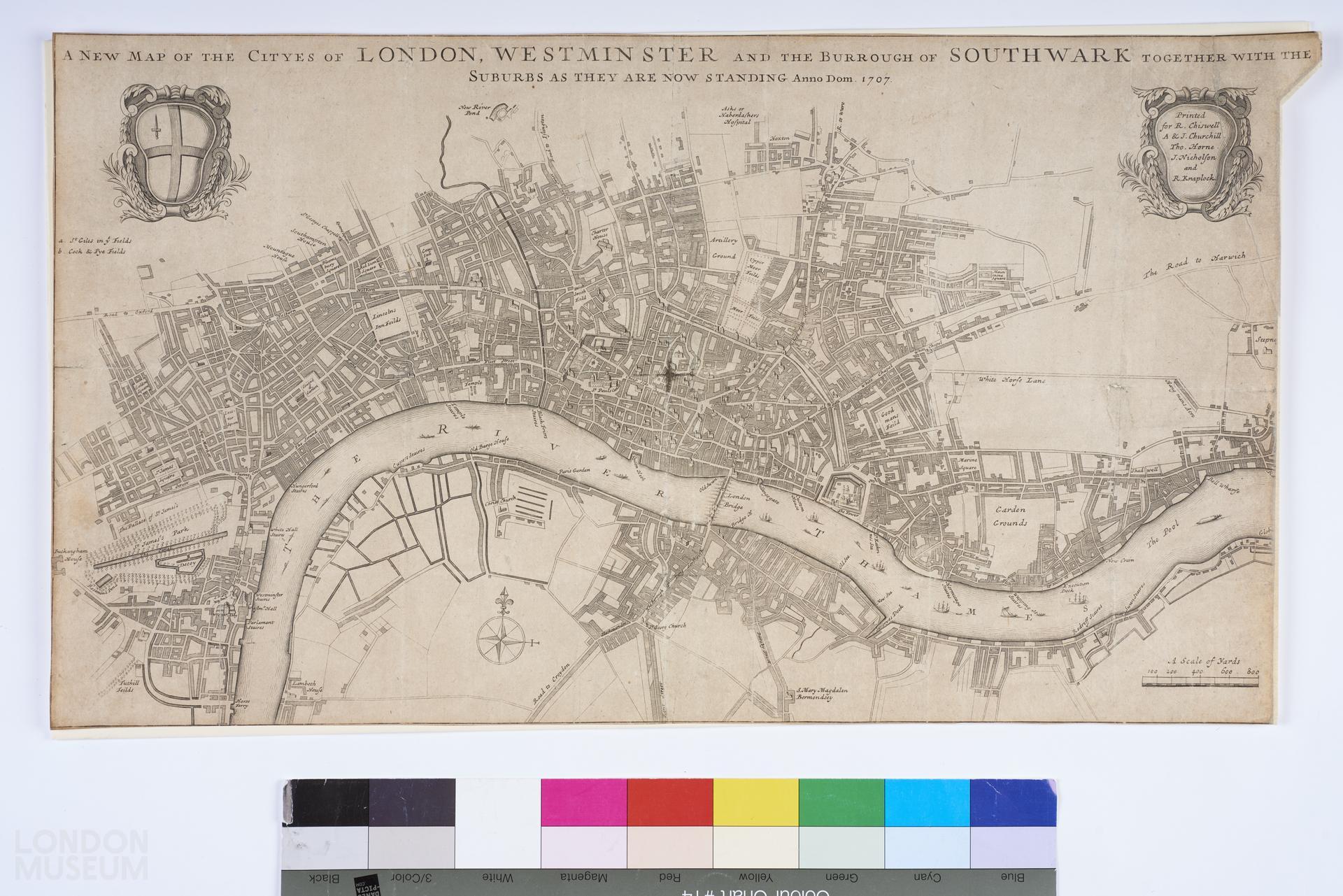 Tourist map of London inscribed 'A new map of the cityes of London, Westminster and the burrough of Southwark together with the suburbs as they are now standing, Anno Dom. 1707' and 'Printed for R. Chiswell, A & J Churchill, Tho Horne, J Nicholson & R Knaplock' within the cartouche.