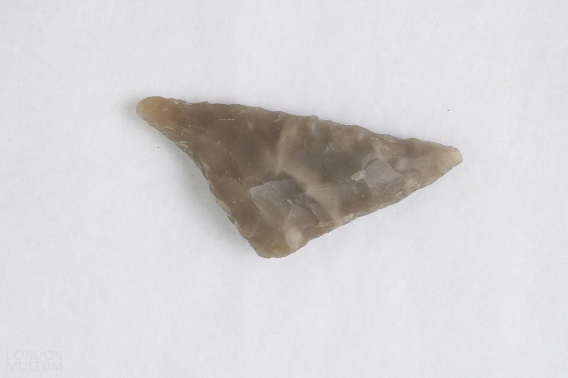 Triangular flint arrowhead. Worked on all edges and both faces.