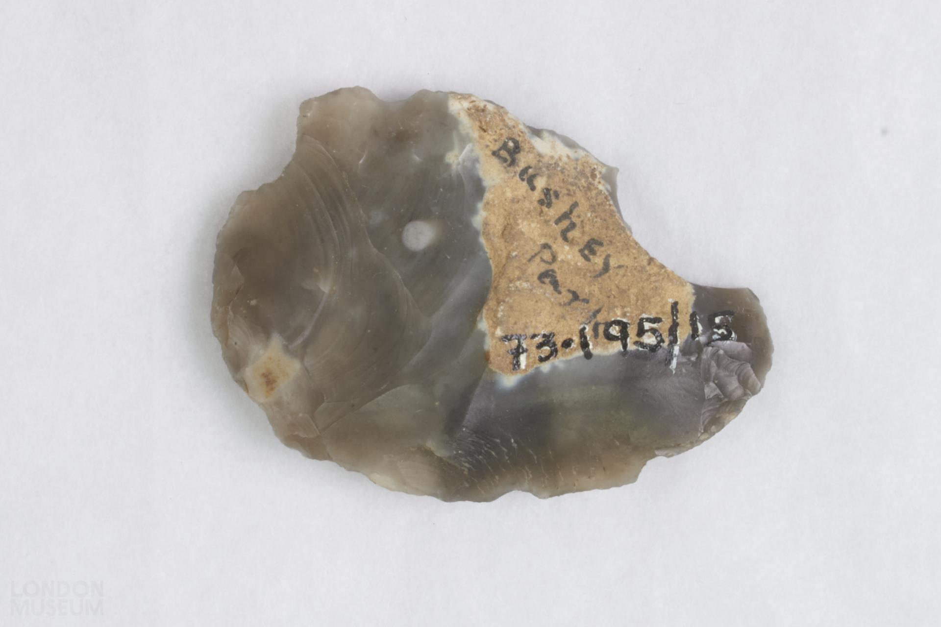 Leaf-shaped flint arrowhead. Bifacially worked. Chipped around edges. Concretion on one face.
