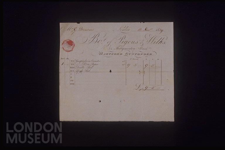 Copper-engraved billhead with handwritten invoice issued by the Dartford gunpowder manufacturer Pigous & Wilks. Dated 12th December 1829 the billhead also includes the address of the firm's office headquarters at 34 Throgmorton Street in the City of London. The French-Huguenot Frederick Pigou and his partner Miles Peter Andrew established a gunpowder mill in Dartford in 1778. This invoice dates from when the gunpowder mill was run by Frederick's grandsons Frederick William & Clarence in partnership with Robert Wilks