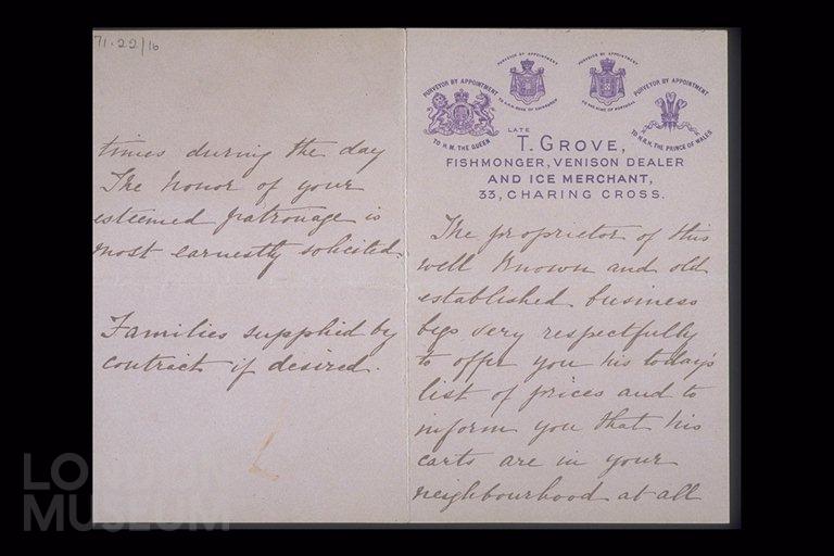 Handbill from T. Grove, fishmonger, venison dealer and ice merchant.
