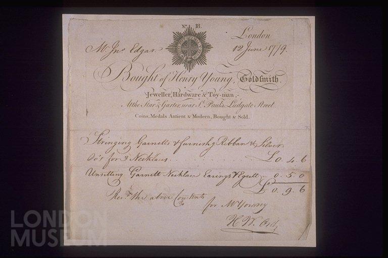 Copper-engraved billhead with handwritten invoice issued by Henry Young goldsmith, jeweller, hardware and toyman located at the sign of the Star and Garter, near St Paul's Cathedral, Ludgate Street. The billhead includes an engraving of the tradesman's sign of the order of the star and garter and notes that Henry Young also bought and sold coins and medals, 'ancient and modern'. The handwritten invoice dated 12th June 1779 refers to payment for the service of stringing 3 garnet and silver necklaces and 'unsetting' a set of garnet jewellery. Presumably the garnets removed from the necklace and earrings etc were used to form the three necklaces.