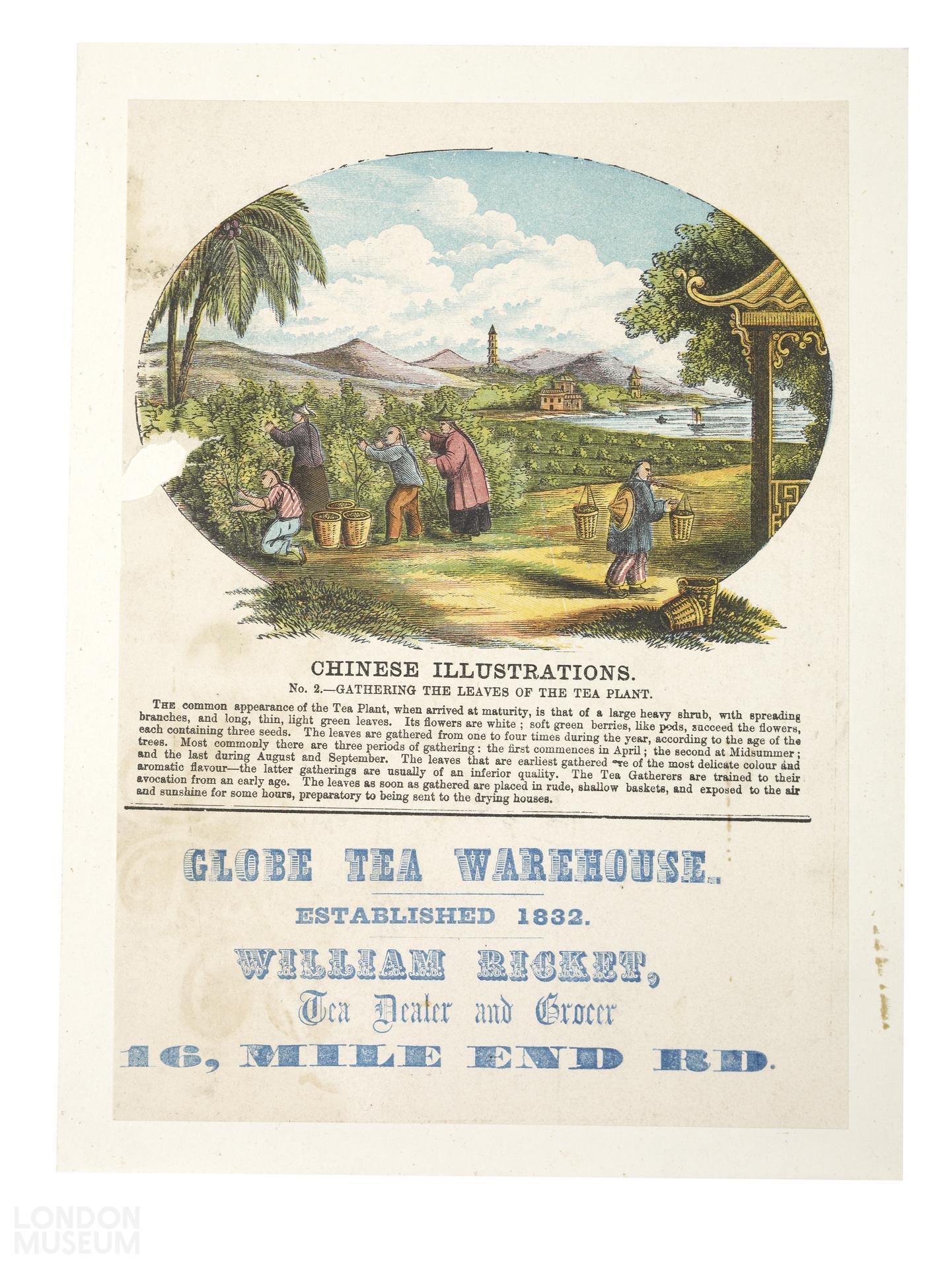 A coloured hand bill or trade card printed for William Ricket, Grocer and tea dealer at the Globe Tea Warehouse in Mile End.