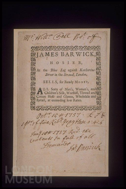 Letterpress trade card publicising the business of the hosier James Barwick, located at the sign of the Blue Leg 'against Katherine Street' in the Strand. The trade card notes that James Barwick sells 'for ready money' all sorts of mens womens and childrens silk, worsted, thread and cotton hose and gloves wholesale & retail. The trade card also includes a handwritten invoice dated 15th October 1737 referring to the supply of a pair of fine ribbed grey hose.
