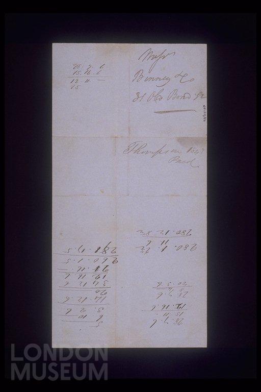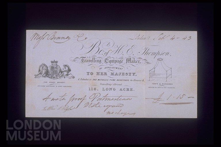Copper-engraved billhead with handwritten invoice issued by H.E. Thompson, 'travelling equipage, tent and marquee maker' located at 116 Long Acre, Covent Garden. The billhead is engraved with the royal coat of arms in recognition of the firm's role as supplier to Queen Victoria and an image of a metallic tube bedstead manufactured by the firm 'for houses and travelling abroad'. Dated September 4th 1843 the invoice refers to the supply of a waterproof portmanteau.