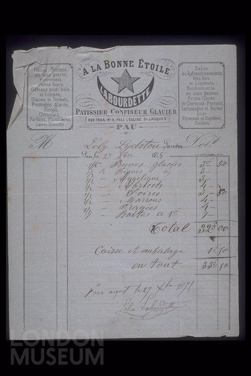 Printed billhead and handwritten invoice issued by the Parisian patissier, confiseur and glacier Labourdette. Dated 1875 the invoice, written in French refers to the supply of glaces, marrons and other goods to the London home of the Lydstone family.