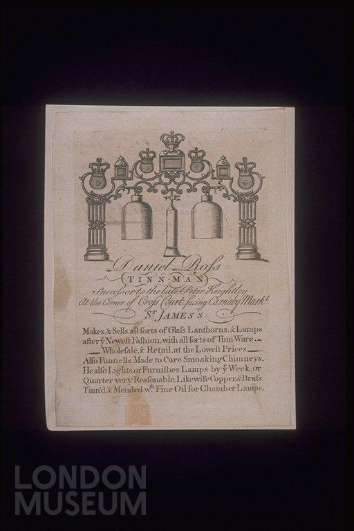 Illustrated trade card of Daniel Rofs, Tinn-Man, metalworker.