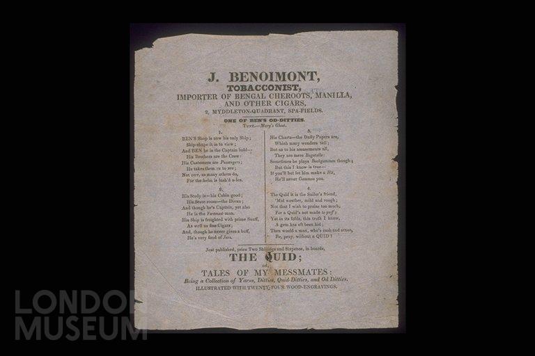 Flyer publicising the publication 'The Quid, or Tales of my messmates: being a collection of yarns, ditties, Quid-ditties, and Od-ditties by a steerage passenger. Headed with the name and address of the tobacconist and cigar importer J Benoimont, located at 2 Myddleton Quadrant, Spafields the advertisement includes a four verse 'ditty' taken from the publication . The frontispiece of the book published by W Strange in 1832 notes that it could be purchased at Benoimont's Cigar Divan at Myddleton Quadrant.
