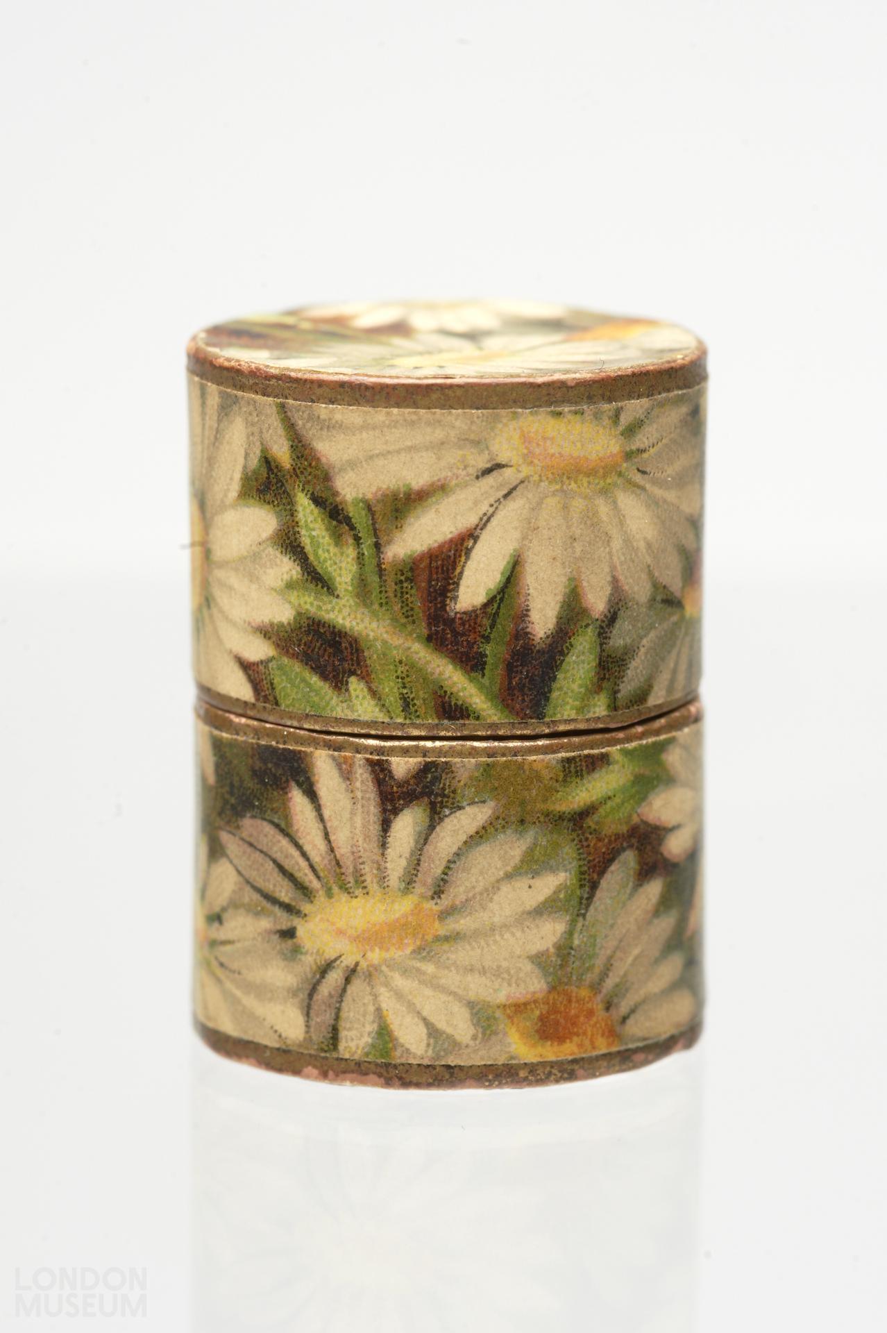 Cylindrical card box decorated with flowered paper. Lid lifts off the top to reveal space, originally for a thimble (A28536a). Blue cotton wool inside.