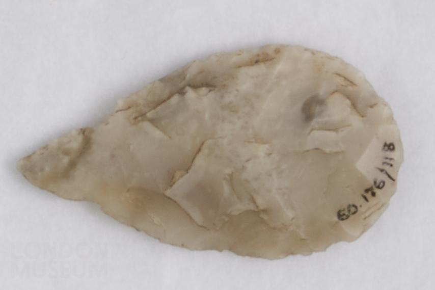 Pointed leaf-shaped flint arrowhead.