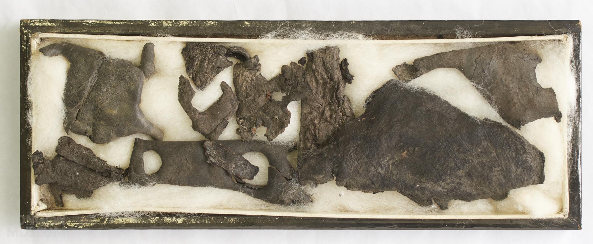 Black leather fragments, approximately ten pieces. Some fragments flaking.