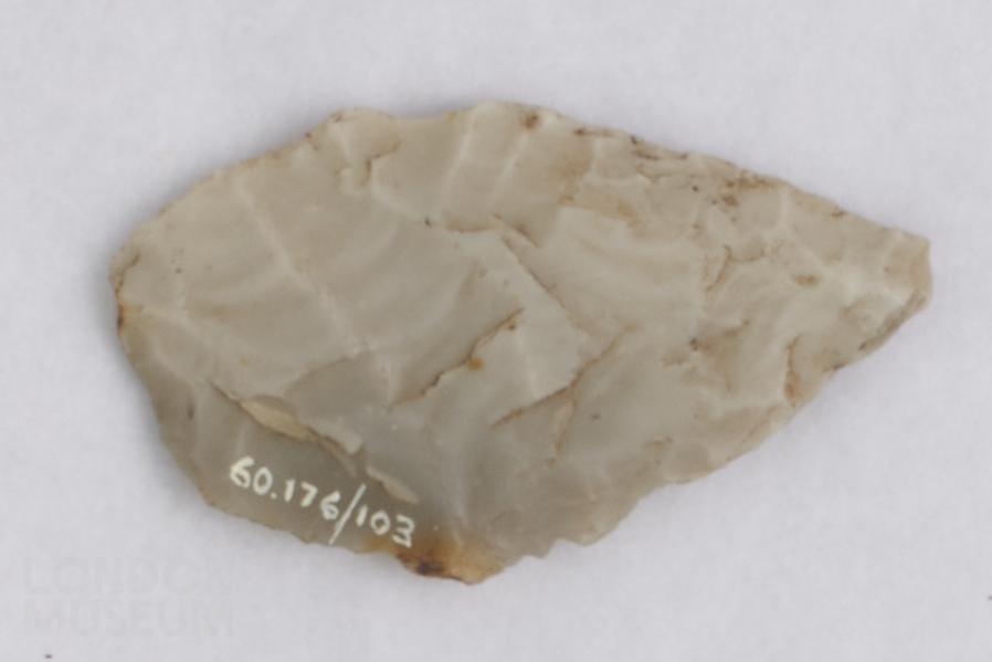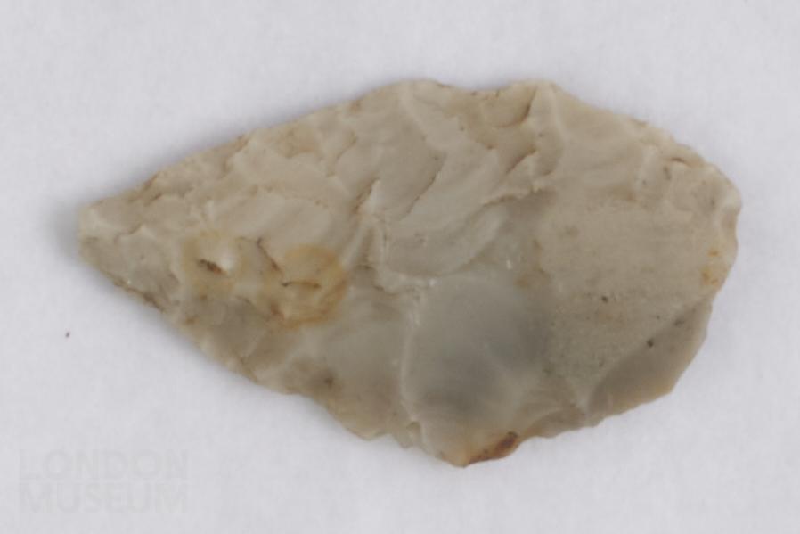 Leaf-shaped arrowhead with the tip slightly broken and the base snapped. Possible traces of grinding on one surface.