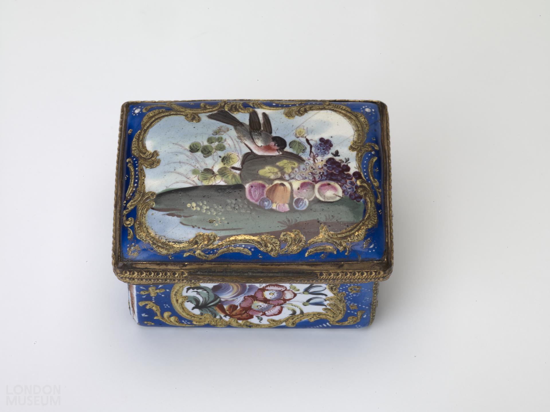 Patch box made of metal with enamelled surface and gilt decoration. The rim of the box and its lid are decorated with incised patterns. The sides of the box and the lid are decorated with a border of blue enamel with a stylised border in gilt relief. Inside each border are enamel paintings of various types of flowers, with the lid containing a scene of still life with fruit and bird by water bank. The underside is white enamel decorated with gilt lines forming a diamond pattern, with small gilt rosettes inside.