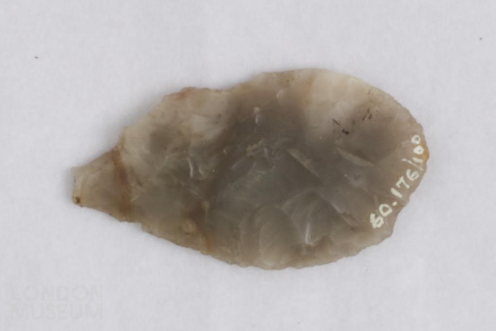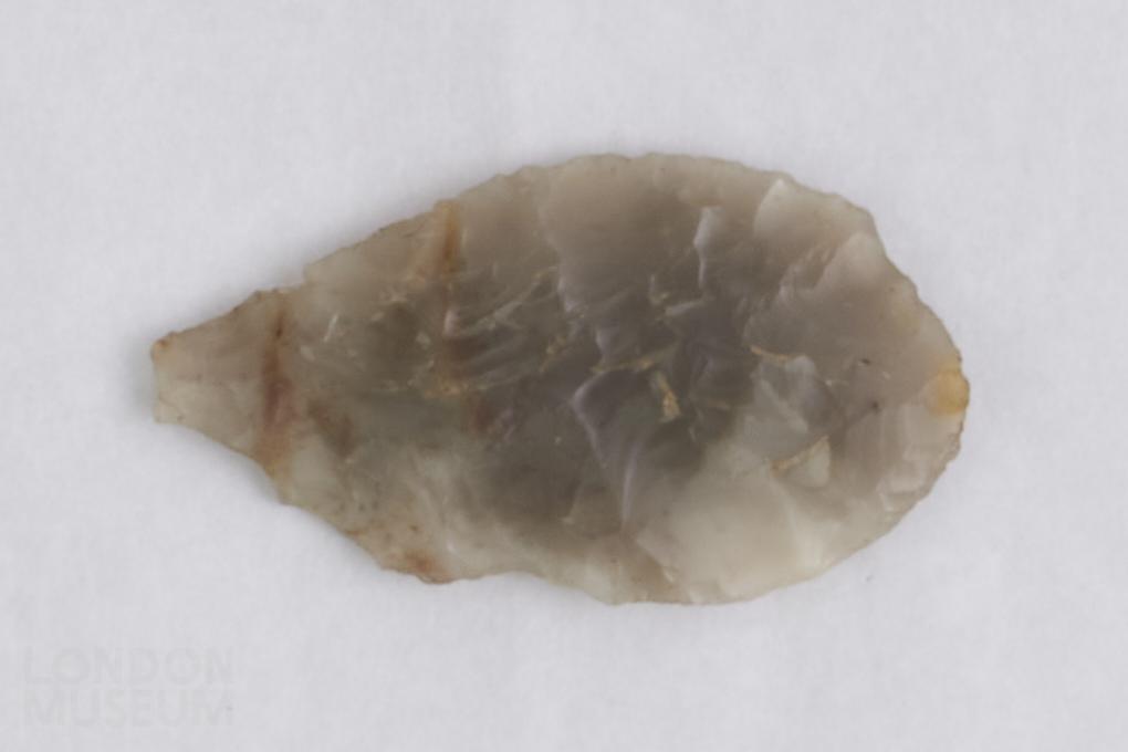 Leaf-shaped arrowhead of grey flint with brown streaks.