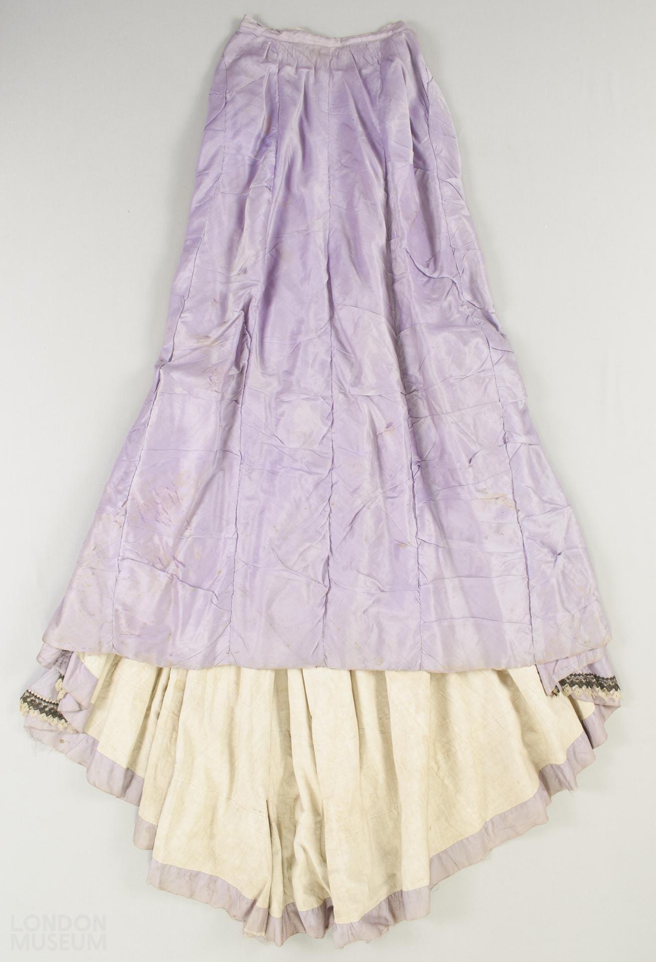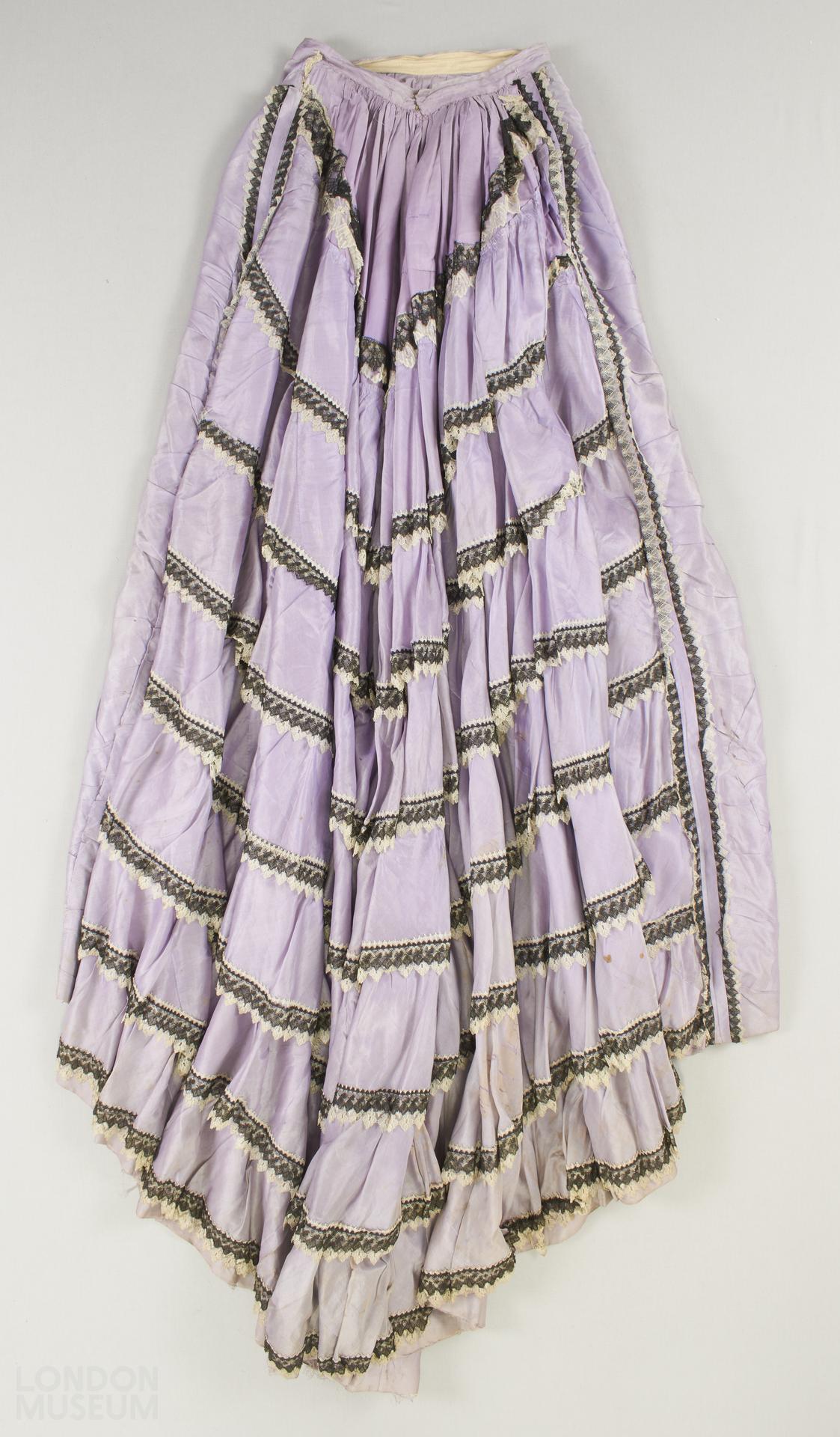 lilac silk skirt with flounces at the back and sides. Flounces trimmed with black and white cotton lace. Metal hooks and eyes at the waist for fastening.