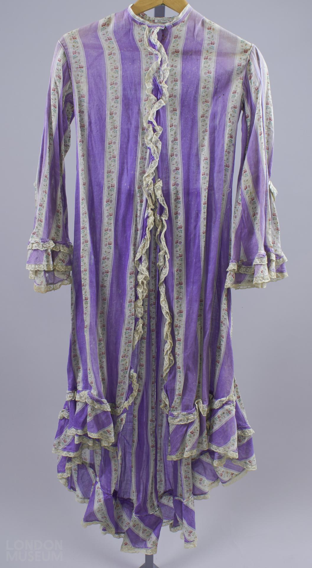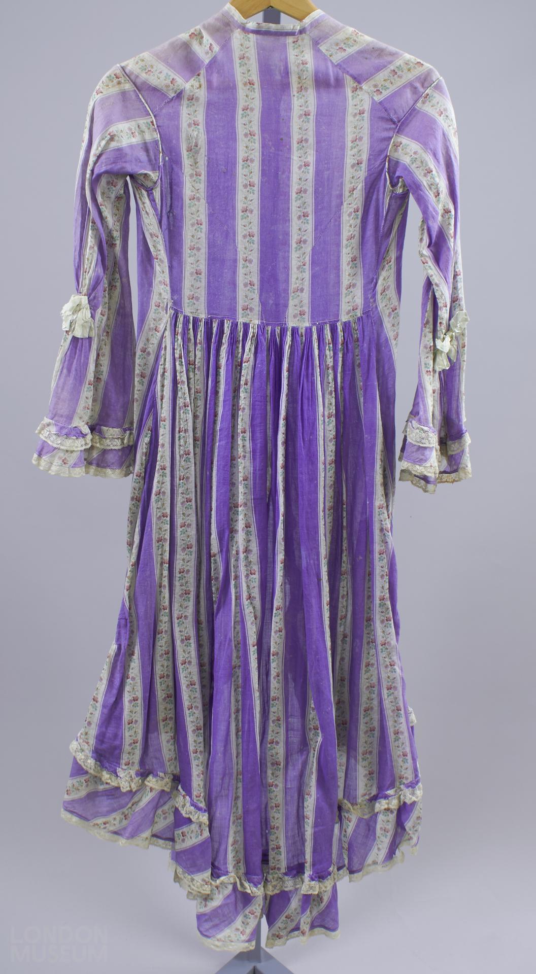 Long bodice with overskirt, purple and floral stripes pattern, cotton. White lace frills on hem, collar and cuffs. Part of a three piece dress of thin cotton, purple stripes with floral pattern. Condition: ripped in some parts, white stains.