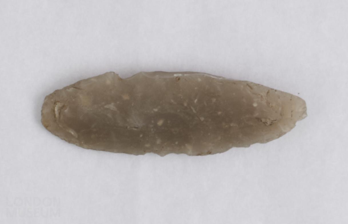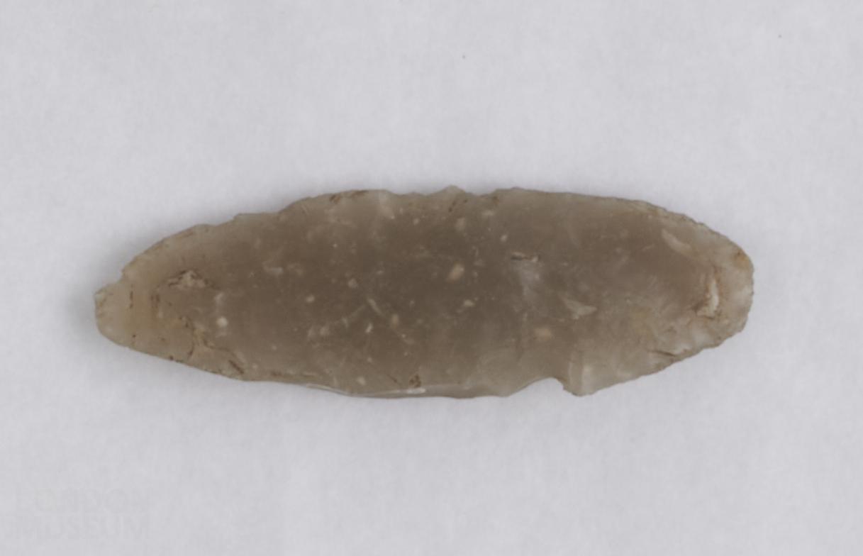 Elongated leaf-shaped arrowhead, with one edge bunted by the loss of a longitudinal spall.