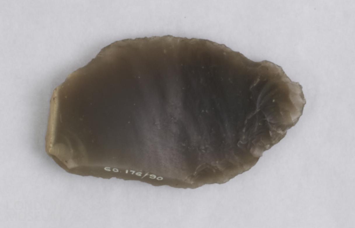 Roughly-shaped leaf arrowhead of brown-grey flint. The bulbar end has a broken striking platform and is only retouched at the tip.