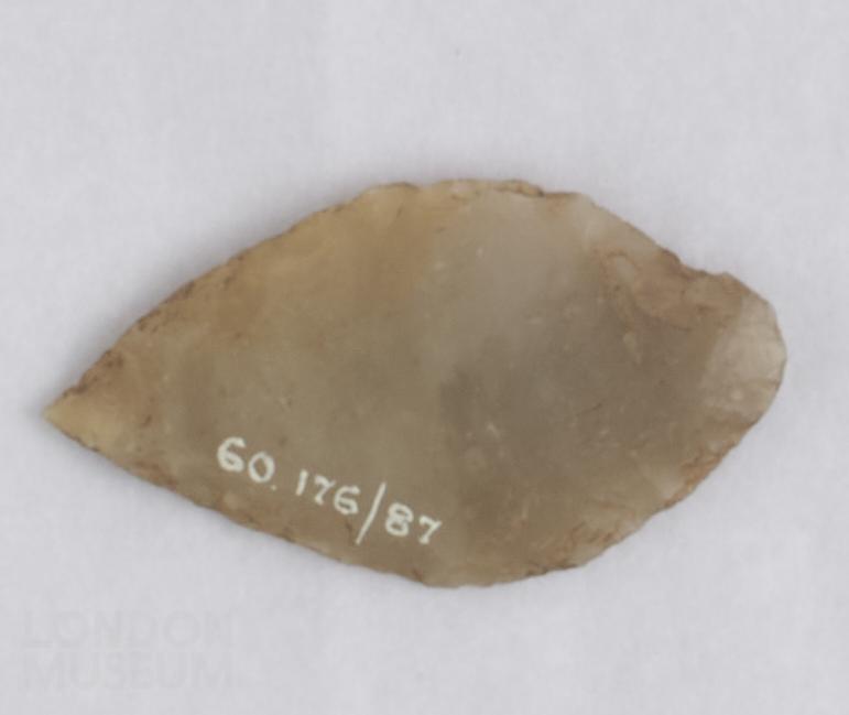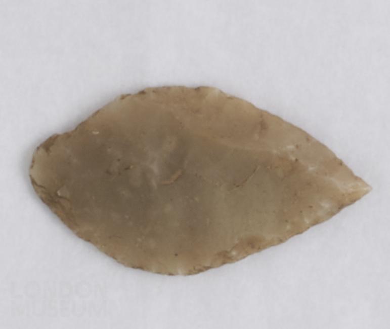 Leaf-shaped arrowhead of fawn-coloured flint, sharply pointed at one end, with the bulbar face neatly trimmed at the edges.