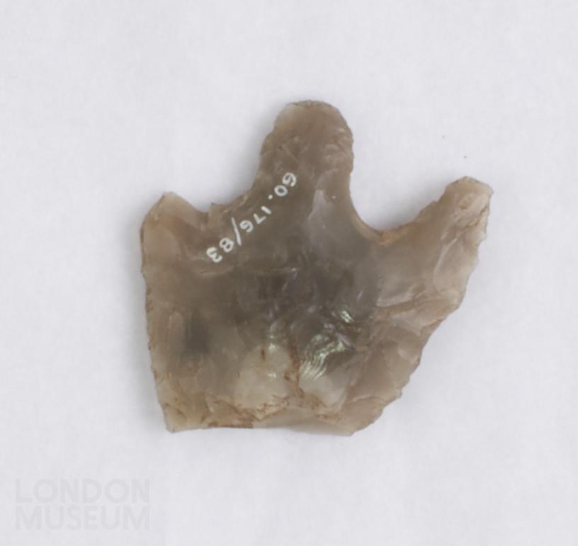 Barbed and tanged arrowhead with the tip and one barb broken.