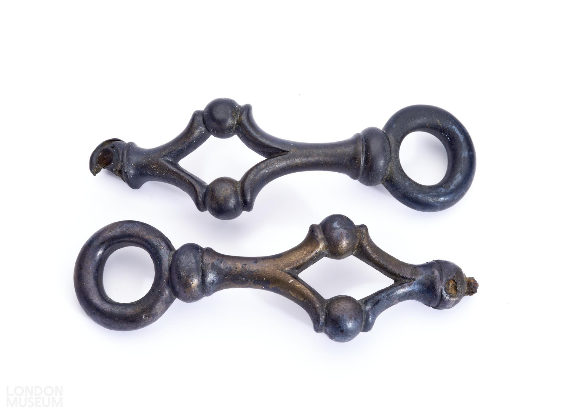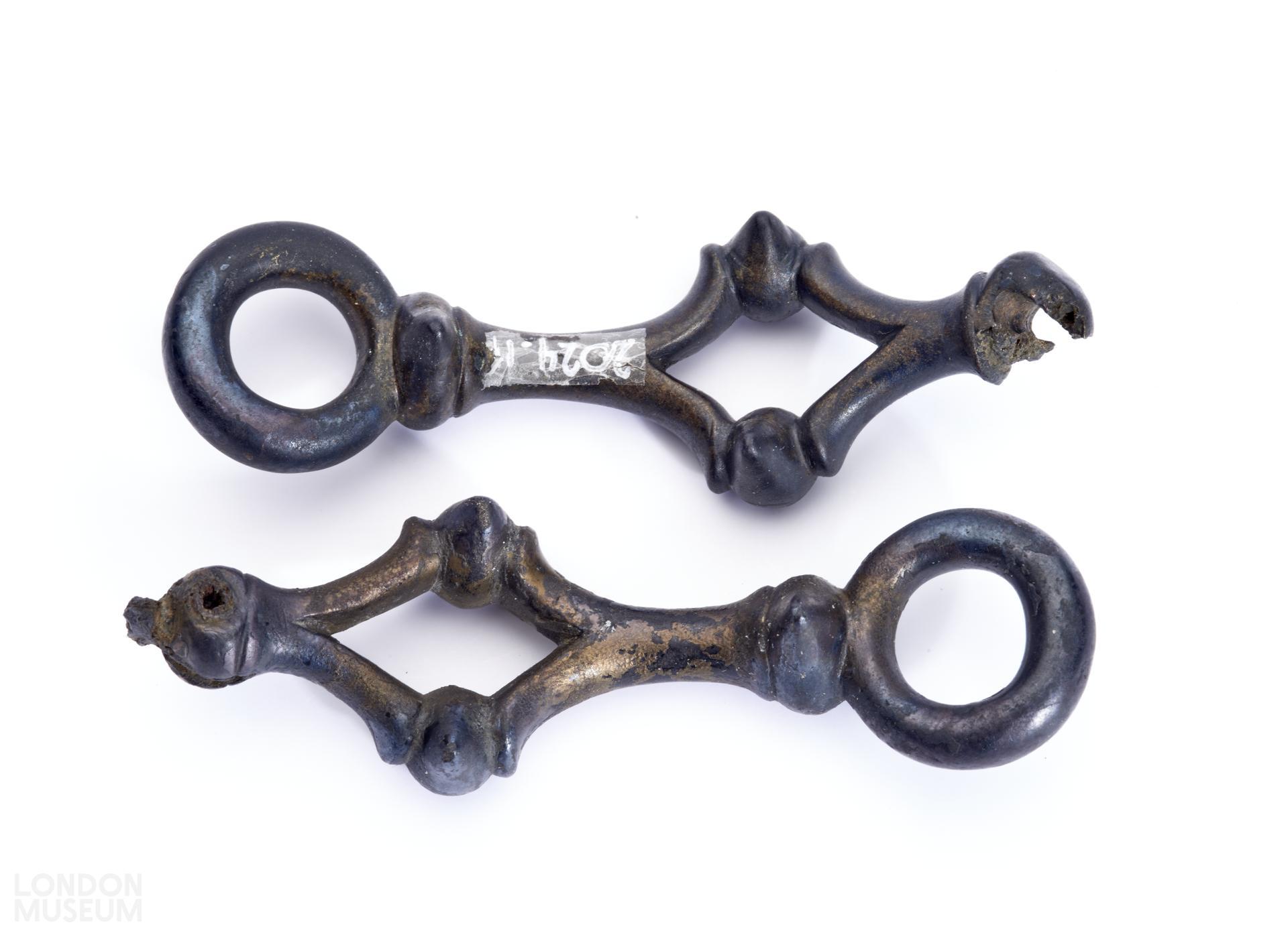 Two incomplete Iron Age studded bronze harness fittings; they are most likely cheek pieces from the same bridle. The first one found is broken across the perforation. The perforation has an internal curve indicating it may have accommodated a ring rather than a stud. A small hole intruding on the upper face of the perforation suggests the harness fitting was probably miscast. The curved bar of the harness fitting divides decoratively to meet two knobs, which are spiked on the underside; there is also a knobbed spike at the junction of the bar with the fitting hoop.