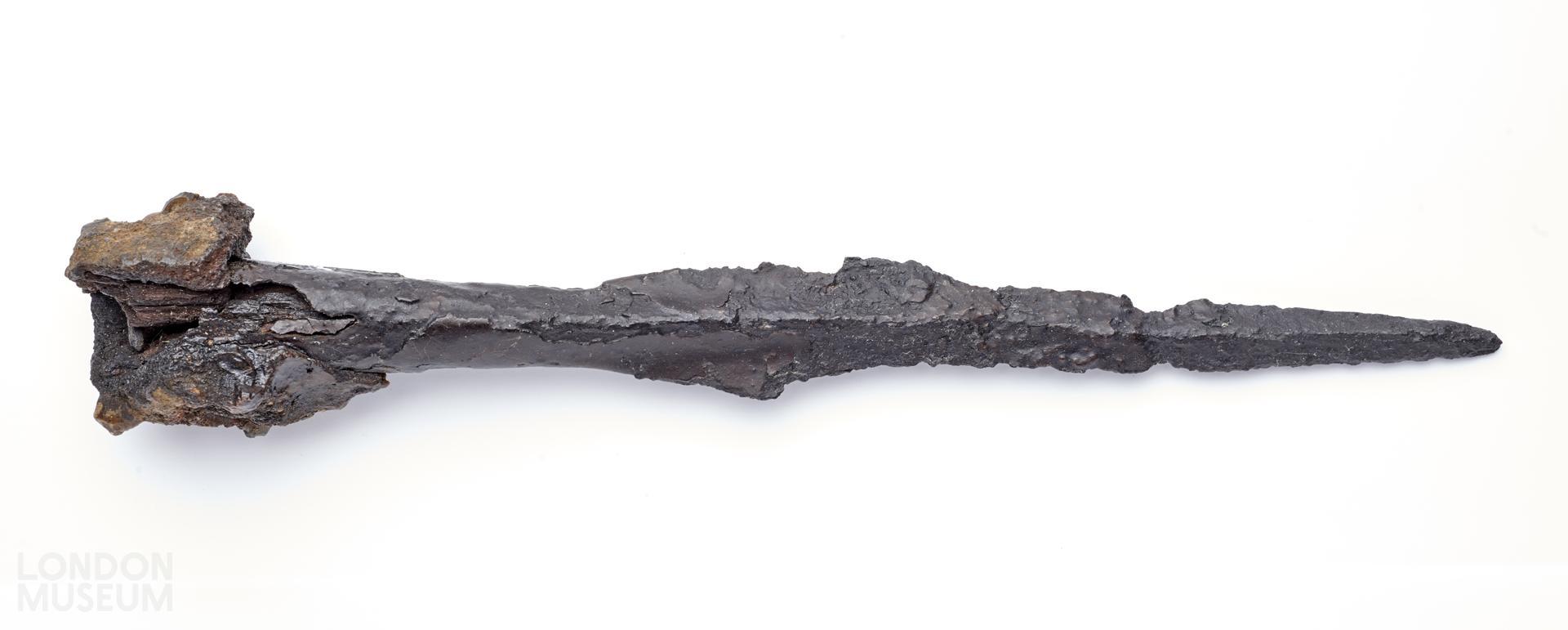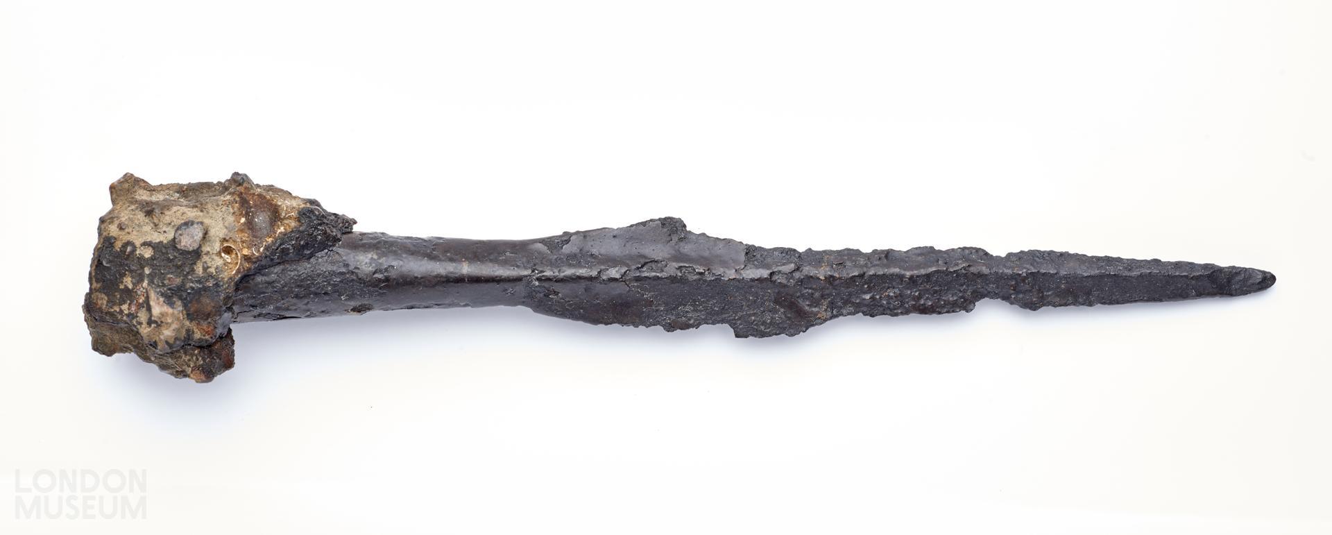 An Iron Age incomplete iron spear head with part of the ash shaft still present within the socket. The spear head has an elongated leaf-shaped blade which tapers to a point with a pronounced midrib. The majority of the edges are missing but there are sections of the iron where the original surface has survived. A small section of the socket is missing. The surviving socket is hollow and circular and does not have overlapping edges which are an indication of Saxon date. There is a river hole with rivet still in situ to secure the wooden shaft within the socket.