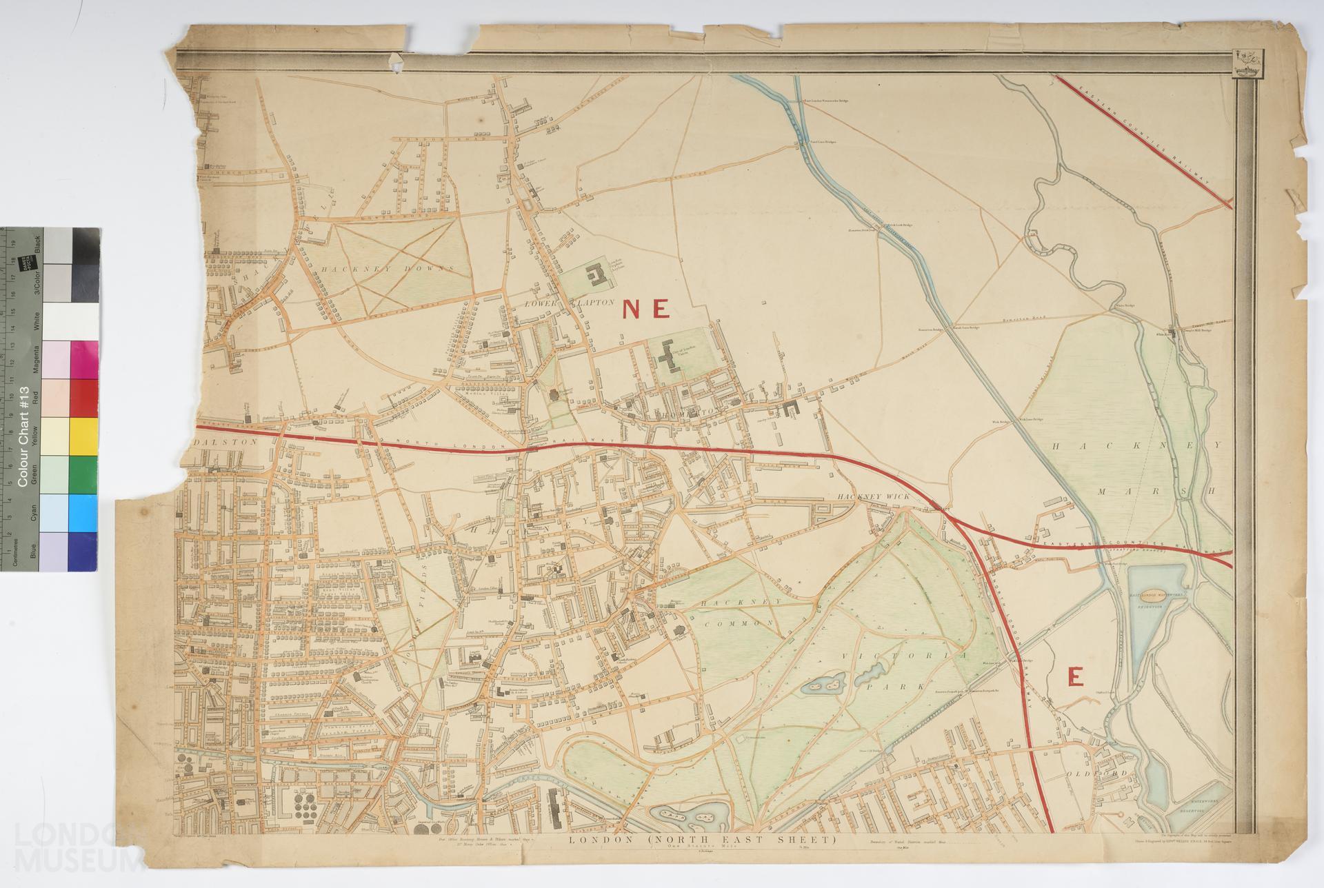 North East sheet of a large map titled ‘London’. Map’s title ‘London (North East Sheet)’, published by Weekly Dispatch, located at Fleet Street, London in 1861. Drawn and engraved by Edward Weller, located at Red Lion Square, London. Shows the north eastern region of London. Extent: Hackney Marsh, Victoria Park, Dalston, World’s End. Trademark or decoration features a flying Hermes or Mercury over river view of Thames, overlooking North bank with St. Paul’s Cathedral in the background. Railway tracks (Eastern Counties Railway and North London Railway) highlighted in red.