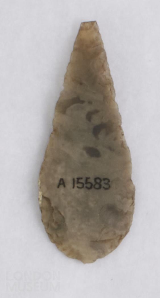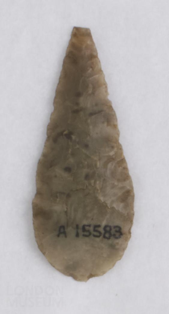 Leaf-shaped flint arrowhead. Smooth on one side. Slightly curved.